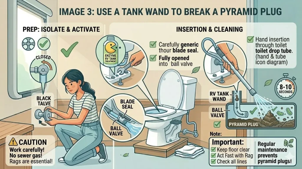 What makes an RV pyramid plug different from a typical clog is its location: it forms inside the holding tank itself, not in the pipe. This is why plunging doesn’t help, and why the fix requires either chemical dissolution or physical agitation — or both.