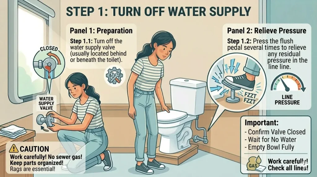 Step 1: Turn off the water supply Close the valve near the toilet or switch off the freshwater pump. Press the flush pedal several times to relieve any residual pressure in the line.