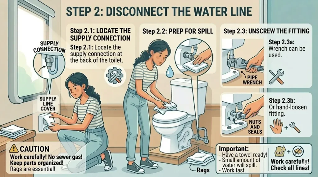 Step 2: Disconnect the water line Locate the supply connection at the back of the toilet. Have a towel ready — a small amount of water will spill. Unscrew the fitting by hand or with a wrench.