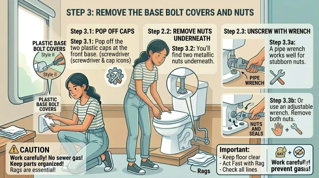 Step 3: Remove the base bolt covers and nuts Pop off the plastic caps at the front base of the toilet. You’ll find two nuts underneath — remove both with a wrench.