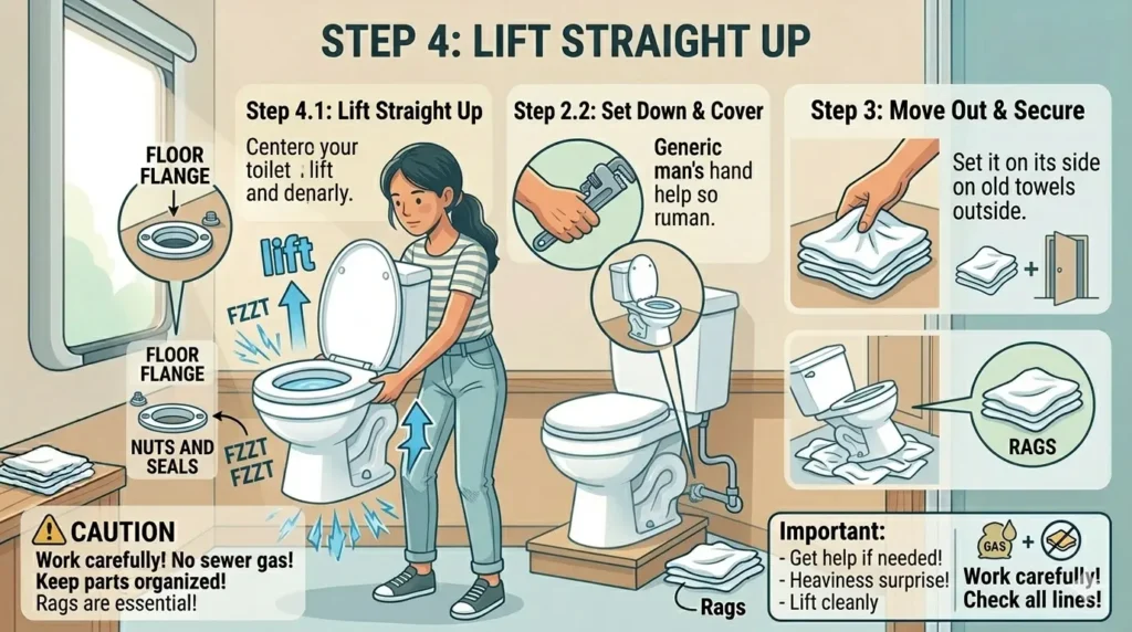 Step 4: Lift straight up The toilet lifts cleanly off the floor flange. Porcelain models are heavier than expected — get help if needed. Set it on its side on old towels outside the bathroom.