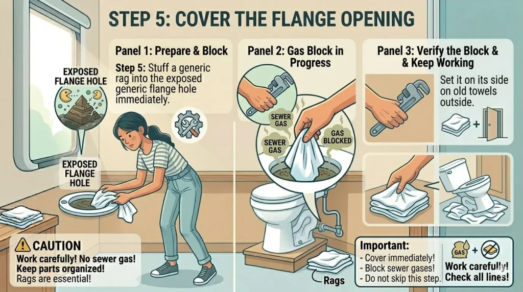 Step 5: Cover the flange opening Stuff a rag into the exposed flange hole immediately to block sewer gases while you work. Do not skip this step.